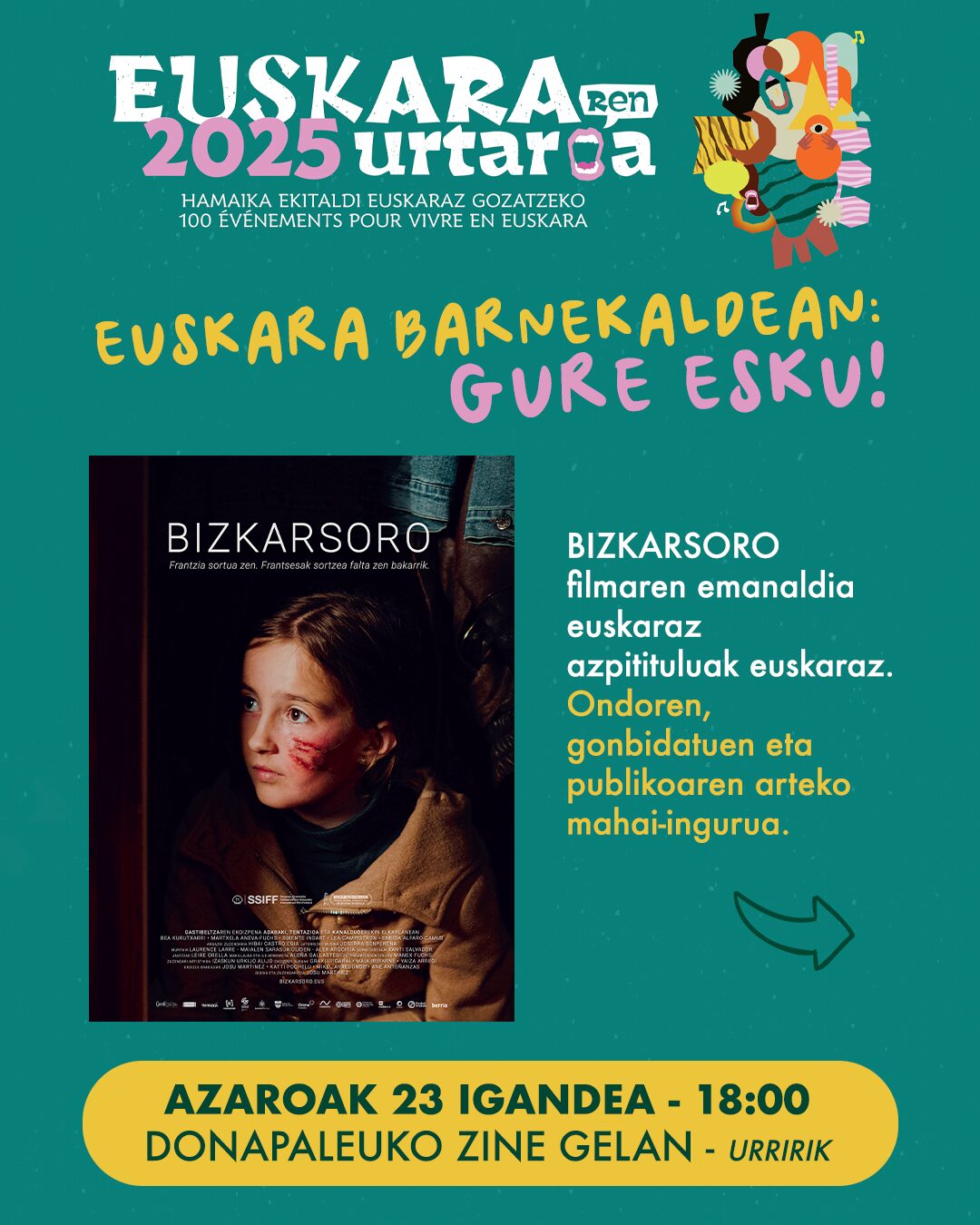 Gaualdia Bizkarsoro filmaren emanaldiarekin hasiko da: obra hunkigarri eta indartsua, gure egunerokoan euskararen lekua eta hizkuntzaren inguruan egiten ditugun erabaki kolektiboak galdezkatzen dituena.